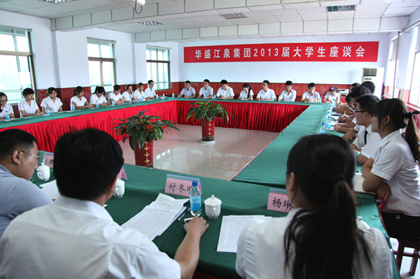 為充分了解2013年新進(jìn)大學(xué)生基層工作情況,加強(qiáng)與員工的思想溝通,8月28日上午,集團(tuán)公司在人力資源與社會(huì)保障服務(wù)中心三樓培訓(xùn)室召開(kāi)了“我與企業(yè)共成長(zhǎng)”大學(xué)生主題座談會(huì)。臨沂市羅莊區(qū)人力資源與社會(huì)保障局副局長(zhǎng)主建軍、管繼忠、臨沂市羅莊區(qū)人力資源與社會(huì)保障局人才交流中心主任王輝、臨沂市羅莊區(qū)人力資源與社會(huì)保障局辦公室主任陳恩民、華盛江泉集團(tuán)辦公室主任汪會(huì)昌、工會(huì)主席付冬明、人力資源部主任李新勝,人力資源與社會(huì)保障服務(wù)中心副主任楊琳琳,相關(guān)部室負(fù)責(zé)人及2013年新進(jìn)大學(xué)生共計(jì)28人參加了會(huì)議。
